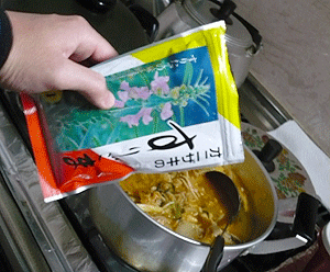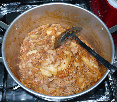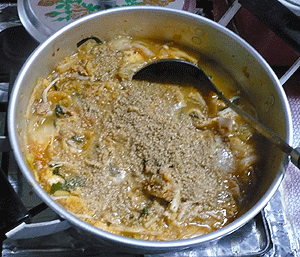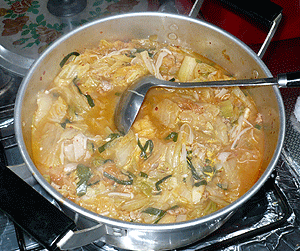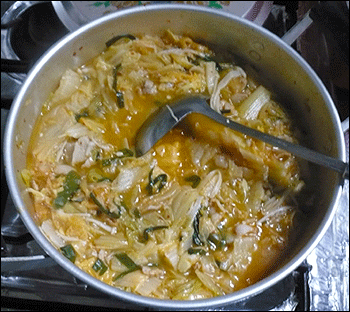 なお、キムチ鍋では具の野菜(特に白菜)からかなり水分が出るので、水は少なめにしておいた方がいいでしょう。上の写真はやや水入れ過ぎ( ^-^;)