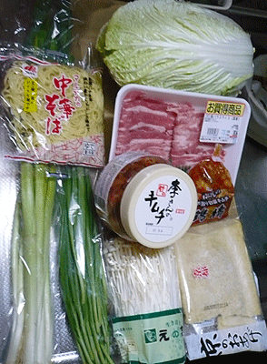 具:キムチ、豚バラ肉、白菜、ネギ、えのき、油揚げ、ニラ、中華麺