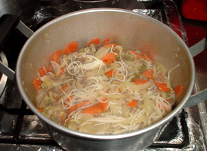 よく分からないテンションでいきなりレシピに反逆。具を炒めてスープを作って、その中にビーフンをぶち込んでみました。