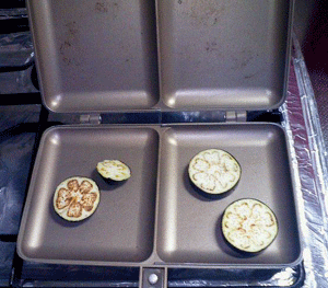 さて、作り方。ナスを1cmぐらいの厚さで輪切りにし、ホットサンドメーカーに並べて焼きます。この時、焼く前にキッチンペーパーなどでナスの断面の水分をふきとっておくのがコゲつかないコツです(試作時はこれをしなかったため、多少コゲつきました)。また、ナスよりも水分の多い食品は確実にコゲついてエラいことになる(関西弁)ので、ホットサンドメーカーでは焼かないようにしましょう。
