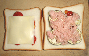 ピザソースはちょっと奮発して、具入りのものを使います。コーン、タマネギ、マッシュルームなど様々な野菜の細切れが入っているものが数社から発売されており、具だくさんのリッチな味わいが楽しめます。こうした具入りスプレッドはピザソース以外にもいろいろな種類があるので、ホットサンドのバリエーションを考える上で強ーい味方になってくれます。