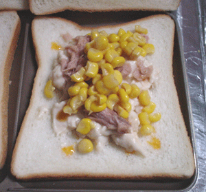 これをパンに適量塗りつけ、シーチキンとコーンを適当にまぶします。グラタンソースはスプーン1本だけだと粘ついて塗りにくいので、スプーンですくって箸で落とすようにすると良いです。