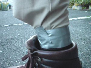 ヒルを物理的に防いでしまう、つまり足元のヒルの侵入口を、ホームセンターで売っている補修用テープでがっちりテーピングしてみたのです。