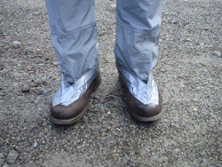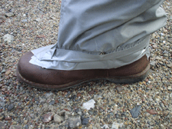 これは思いのほかうまくいきました。このテープ(アサヒペンのダックテープ)は粘着力が強く、かなり歩いても隙間があかなかったのです(ただしハードな登山の時は、昼食休憩時に貼り直した方がいいでしょう)。また水にも強いため、靴が濡れても平気でした(さすがにひざ上水深の渡渉をくり返すと、スパッツに貯まった水が内側から流れて剥がれてしまいますが・・)。
