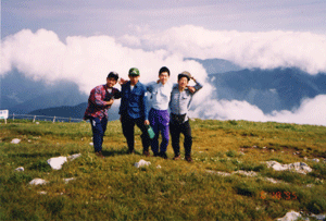 山頂付近にて、パーティーの仲間たちと。(しじみは右から2人目)