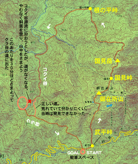 しじみはかつて下図のコースでコクイ谷を歩いたことがあります(コースタイムは7時間ぐらい)が、その時は源流部で道に迷ってエライ目にあいました。コクイ谷を南下した場合、道が川から離れる場所がかなり分かりにくいです。道迷いを避けるためには北上することをおすすめします。
