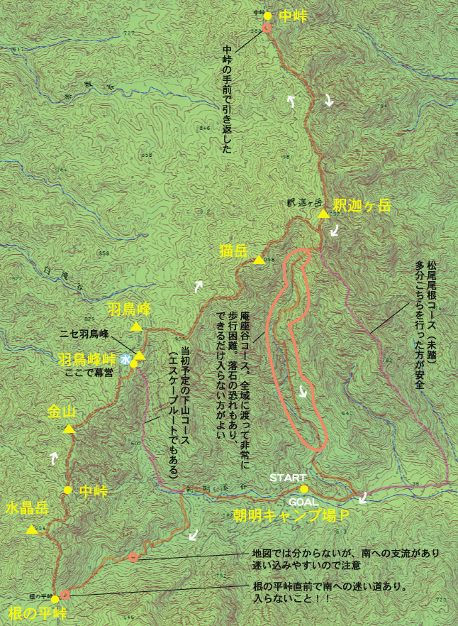 いったいテープの道は何だったのでしょう。地形的に見ると国見岳・ハライドへのショートカットかな・・まあそれはそれで近道なのかもしれないけど、しかしいかにも迷い人を量産しそうな道です。バリエーションルートを作っている方々は、まず分岐点で行き先を明記してほしいものです。あなたの作った道をあの世行きの道にしないために・・。(※)