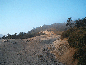 さあ、その次はいよいよ羽鳥峰峠です。道が稜線を外れたと思ったら、視界がぽっかりひらけました。本日の幕営場所、しじみお気に入りの砂礫地帯に、ついに到着です。