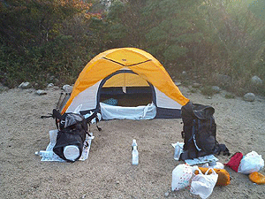 そしてテントを張り、夕食の準備。水場の水量が思いのほか少なく、ペットボトルで汲むと砂が混じってしまうので、浄水器が役に立ちました。