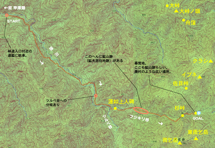 甲津畑の集落を迂回して渋川に出、林道分岐地点で駐車。ここから登山開始です。しばらくは並んで歩ける広い林道で、ガンガン距離を稼げます。