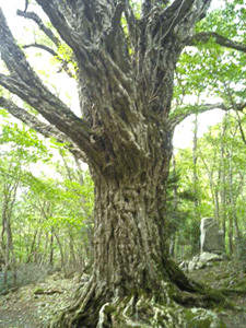 フジキリ谷をさかのぼり、蓮如上人ゆかりの石碑、というのを過ぎてしばらく行くと、見上げるほどに大きな、シワシワの樹皮をもつ木に出会いました。たしか山たまごさんが「で・で・でっか〜い!」と紹介されていた木です。うーむこれはスゴイ!