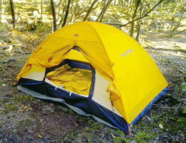 さっそく荷をおろし、テントを張る場所の地面から小石を丹念にどけて整地します。そしてアルミシートを地面に敷き(アルミ側が接地面)、その上にテントを張ります。さらにテントの床にレスキューシートを敷き込みます(これも銀色側が接床面)。いずれも断熱効果を狙ったものですが、おかげでテント内はポカポカ暖かく快適でした(^-^)