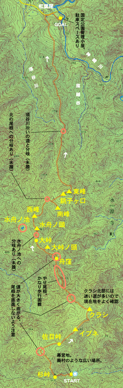 自分が迷ったから言うわけではないですが( ^-^;)、ここ舟窪は確かに南北どちらから来ても、間違って北東尾根に入り込みやすい地形です。くれぐれもご注意を!