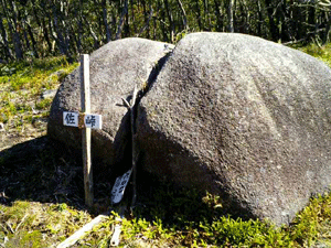 さて、話は戻ってイブネ縦走。北東尾根をズンズン進み、少し下ると佐目峠です。ここには面白い形の岩があります。いい具合に割れています。