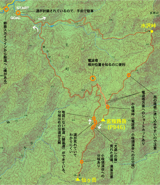 ヒョイヒョイ進むMに対し、ナメクジのようにズリズリ這うしじみ。まあ何とか突破し、その後はそれほど難所もなく、宮指路岳出発から1時間半ほどで、ついに仙ヶ岳に到着しました。これで以南の既踏破ルートにリンク!トライフォース!
