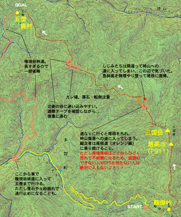 P803から試行錯誤の前進をくり返して3時間半、ヤブから吐き出されるようにしてようやく五僧廃村に着きました。後から思い返しても、ここは鈴鹿スペシャル全ルートの中で最悪最凶のルートでした。良識ある読者の皆様は絶対行っちゃダメですよー!