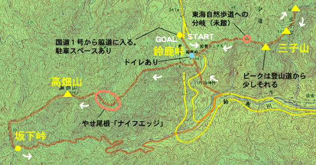 少し不安だったのは、事前情報によると、この尾根道には「ナイフエッジ」という何だかすごそうな名前の、切り立ったやせ尾根岩場があるらしいこと。確かに地図上にもそれっぽい箇所があります。雨降りではちょっと危険なのではないか・・とビクビクしていたんですが、結局どこがそうだったのかよく分からないまま高畑山に着いてしまいました。何とも拍子抜けでした。往々にしてすごいふれ込みのものほど大したことがないもんですね。全米が泣いたみたいなもんでしょうか。