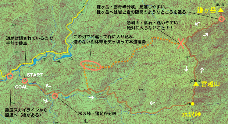 帰りは同じ道も何だから、地図にある鎌尾根の途中のショートカットを使おうと決めていました。