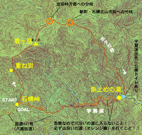 ここから宇賀渓の谷道をさかのぼって進むのですが、途中で道が分岐していました。「山道コース」と「川沿いコース」。「どうする?」というMに、しじみは楽そうな川沿いコースを希望。しじみは昔ばなしでいえば大きいつづらを選ぶタチです。欲張りで身を滅ぼすタイプです。この時も、その選択が全ての間違いでした・・。