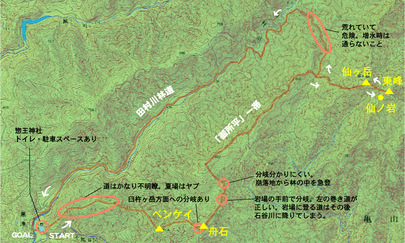 帰路は田村川・石谷川分岐まで戻り、田村川の支流の谷道を下って田村川林道を目指します。しかしこの谷道が、またまたリポビタンDのCMに出てきそうな荒れたコース。ロープにつかまらないとすぐ川に真っ逆さまな崖っぷちの道が続きます。荒れたコースでいつも思うのですが、こういうとこにロープを張ってくれる知らないどこかの誰かさん、本当にありがとうございます。こんど肩でも揉ませてください。