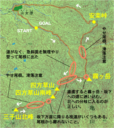 (安楽峠←→四方草山←→三子山北峰のルートをとったとして)6時間。距離は短いのですが、道が悪く岩場とヤブが連続するため時間がかかります。 ※あくまでしじみ(男・20代後半、歩行速度は少し遅め)の歩行時間なので、ご参考程度に・・ |