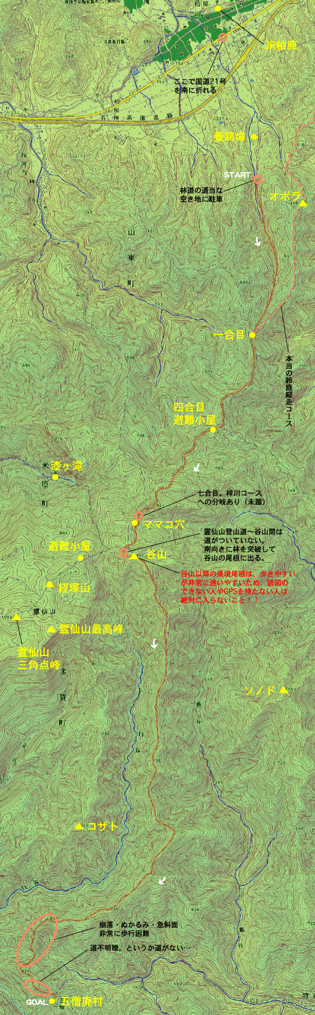 厳密な意味で縦走すなわち稜線踏破を目指すならば、谷道の柏原林道ではなく、関ヶ原の長久寺という集落から尾根にとりついて、竹尻〜観音峠〜オボラ(天神)〜二本杉(柏原登山道一合目)と進むのが本来なのですが、このルートはMが「オレもう前に歩いたから行きたくない。すごいヤブやったし」とのことで却下。したがって本当に鈴鹿スペシャルを達成したのはMだけかもしれません。(まあ二本杉以北はほとんど里山で、一般には谷山が鈴鹿山地の北端とされているようですが・・←自己弁護)