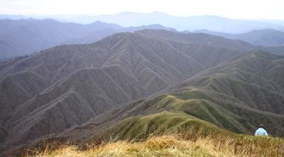 広い頂上の片隅に陣どって昼食。風がびゅうびゅう吹いてかなり冷えます。お湯を沸かして熱い紅茶を飲み、Pさんも少し元気を取り戻しました。実はPさんにナイショでインスタントみそ汁も買い込んでいたんですが、もう水がなくて作れないのでそのままナイショにしておきました。やっぱりオレってジェントルマン。なお、このみそ汁は2005年5月現在、まだしじみの登山道具箱に入っています。もはや記念品です。