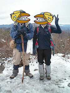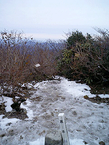 ヤブをかきわけかきわけ頂上に近づくと、地表にうっすら雪が積もってきました。ミゾレ風のいわゆる腐れ雪で、泥濘にさらに拍車がかかります。泥雪を蹴散らしながらなおも前進し、ようやくスポンと頂上の小広場に出ました。