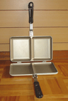 ちなみにこの器具、プレス部分が2つのもの(写真)と、1つのものとがあります。ダブルは2つのサンドイッチが同時に焼けます。単独行専門の方、また荷物の軽量化に凝っていらっしゃる方以外は、ダブルをお勧めします。