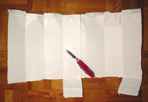 牛乳パックまな板(2枚、中央は五徳ナイフ)