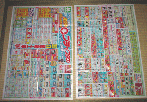 さっそく毎日の新聞にはさまってる広告チラシの中から、大きいのを見つくろってみると、あるある。1枚でタタミ1/3畳ぐらいのやつ。主に家電製品のチラシです(ミ○リ電化とか・・)。