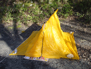 そう、ツェルトの裾(?)というのは左右に広げるのではなく、本当は内側に折り込んで床にするのが正解なのです。(このページの「ビバーク・ツェルト1」参照)