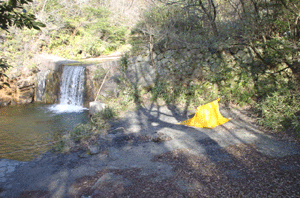 テントサイト、じゃなかったツェルトサイトはこんな所です。標高は300m程度なので、気温は平地とさして変わりません。本当はせめて700m、できれば1000mぐらいの所でやりたかったのですが、そんな高さまで車で行ける場所が思いつかなかったので、高度が足りない分は着る服を少なくして調節することにしました。そこらへん適当です。