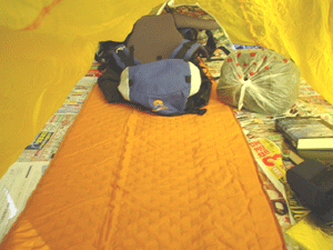 ツェルトの中はこんな感じ。エアマットを敷いて空のザックを敷いて寝床完成。左右の裾を広げたおかげで横幅も広く、退屈しのぎの本とか置きまくりです。この広さが後でアダとなるのですが・・。