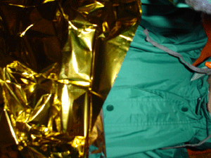 ・・ところが。サイトでも絶賛したはずのこのシート、悲しいことにビバークでは、思ったほどの効果はありませんでした。いや確かに断熱力はかなりのもので、ところどころは暖かいのです。しかし思わぬ欠点がありました。このアルミのシートは、毛布のように柔らかくはないのです。クッション性がないというのではありません。くるまろうとしても体に密着してくれない(隙間ができる&開いてくる)のです。