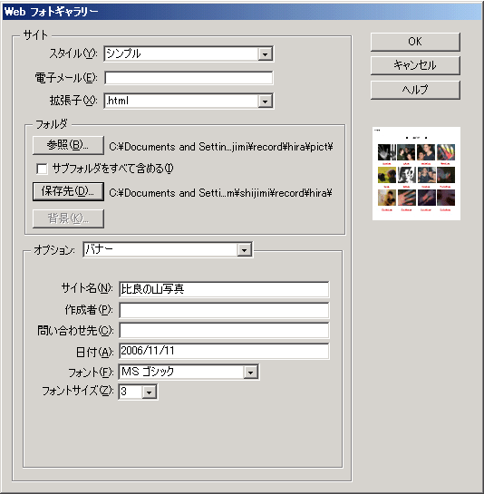 どのぐらい簡単かというと、PEを起動して、ファイルメニュー→Webフォトギャラリーを選択し、以下のようなダイアログが出たら、元フォルダ(画像の入っているフォルダ)と生成ファイルの保存フォルダを指定して、あとサイト名とか日付とかを入力して、OKをポチッと押すだけ!
