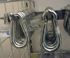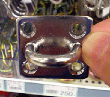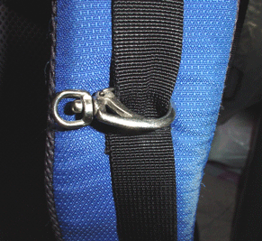 普通はこんな物持ってないと思いますので( ^-^;)、ホームセンターで適当な金具を入手してください。ナスカンやアイプレートを使うのがいいと思います。Kさんのザックに同様の装置を取り付けた時にはナスカンを使いました。